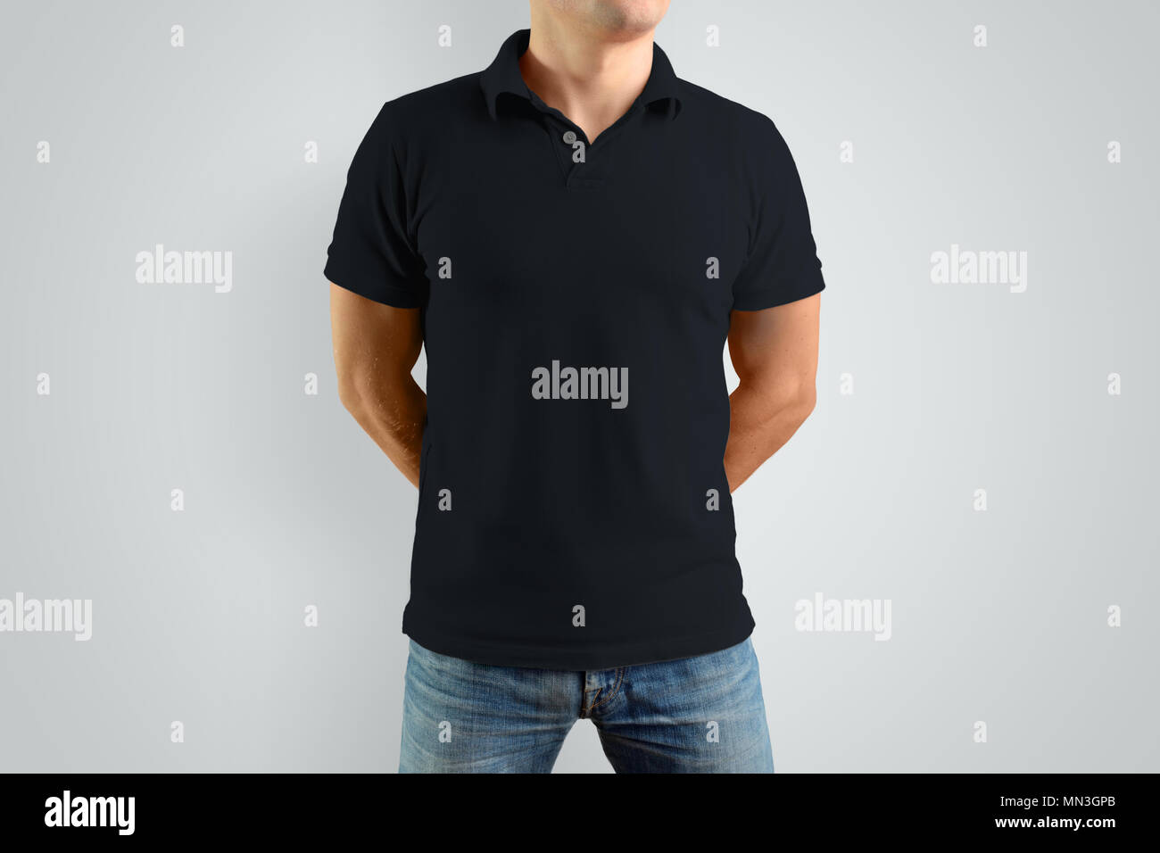 Maqueta Polo Negro Sobre Un Hombre Fuerte Con Sus Manos Detras De Su Espalda Aislado Sobre Un Fondo Gris Una Plantilla Puede Ser Utilizada Para Su Diseno Fotografia De Stock Alamy